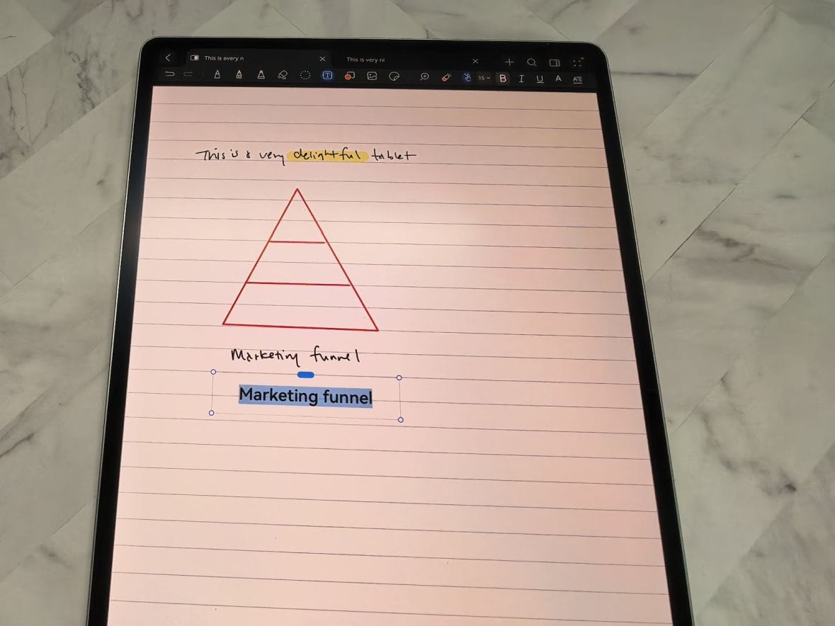 The Huawei M-Pencil (3rd gen) stylus was adequate for writing, and Huawei Notes is a very polished app designed just for that. The feel cannot compare to my reMarkable Pro, but it does feel less plasticky than other styluses I've tried.